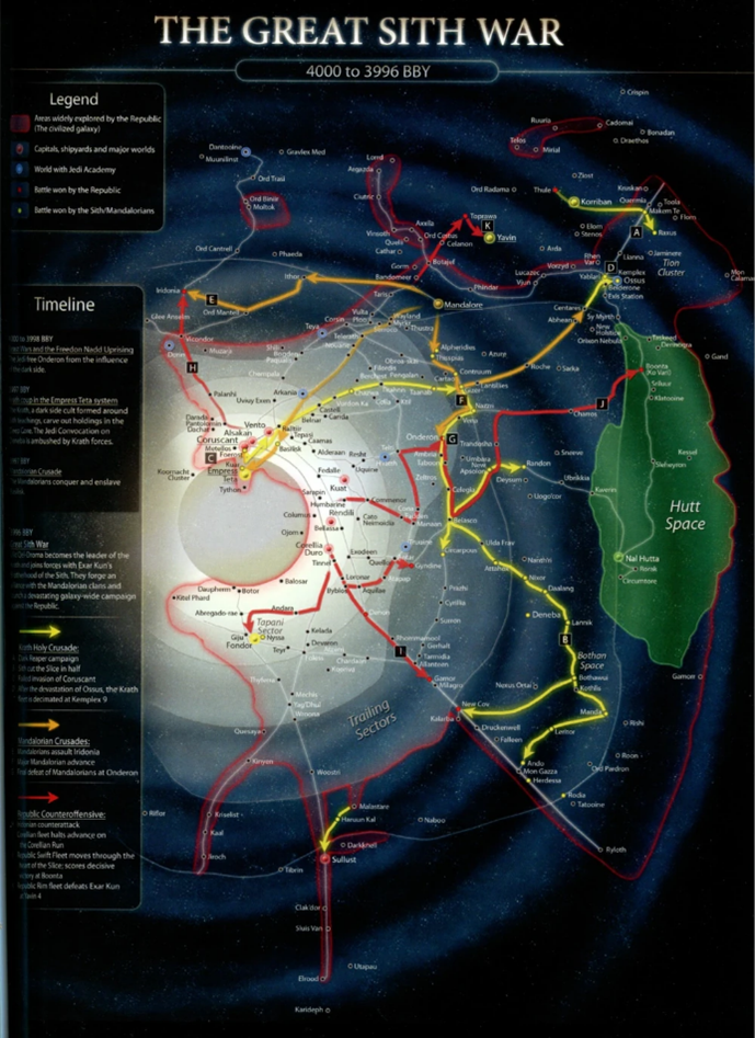 A Nagy Sith Háború a Köztársaság világainak negyedére volt végzetes hatással. Az ossusi pusztítás következtében a Jedi Rend áthelyezte székhelyét a galaktikus fővárosba. Mandalor, a Végső, kihasználva a káoszt, újjászervezte a mandalori harcosokat (ők lettek mandalori neo-crusaderek, vagy magyarul újkeresztesek) és hadseregével hódításba kezdett olyan világokon, ahova a Köztársaság keze nem ért el a hatalmas pusztítás következtében. Nem sokkal később, pedig magát a Galaktikus Köztársaságot vette célba, de ebben már az Ismeretlen Területeken rejtőzködő valódi sith uralkodó keze is benne volt.