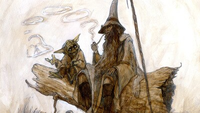 Az előzményfilmek ugri-bugri Yodája számomra kevésbé szimpatikus, viszont Yoda ezekben a történetekben is a bölcs öreg marad, aki távolba lát (bár nem elég távolba), s jó kapcsolatot ápol a kisemberekkel… na meg a nagy szőrös vukikkal. Ráadásul Gandalf sem csupán a háttérből ad bölcs tanácsokat, hanem maga is kardot forgat és harcol, szembeszáll a balroggal és a Boszorkányúrral, ahogy Yoda is kész fegyvert rántani, hogy megküzdjön Dooku gróffal vagy Darth Sidioussal is. A gandalfi jelleget Dave Filoni is aláhúzza, aki meg is örökítette rajzon a két figurát.